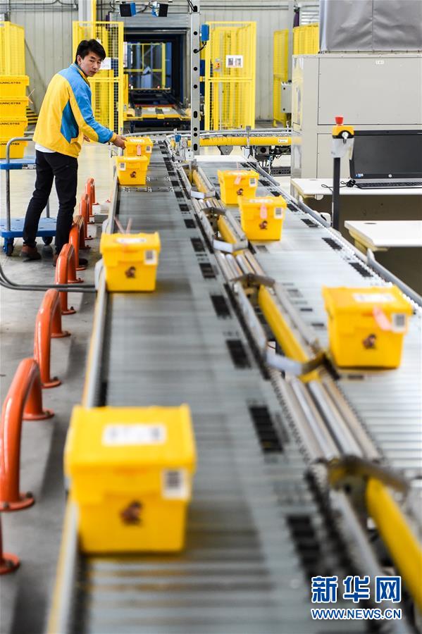 在江苏南京苏宁云仓物流基地,工作人员将包装好的“共享快递盒”放到传送带上,准备进行分拣运输(2017年10月31日摄)。新华社记者 李博 摄