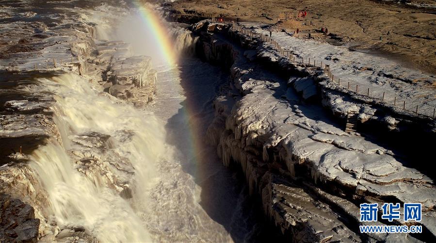 12月11日,黄河壶口瀑布上空出现彩虹,美不胜收(无人机拍摄)。 新华社发(刘宏达 摄)