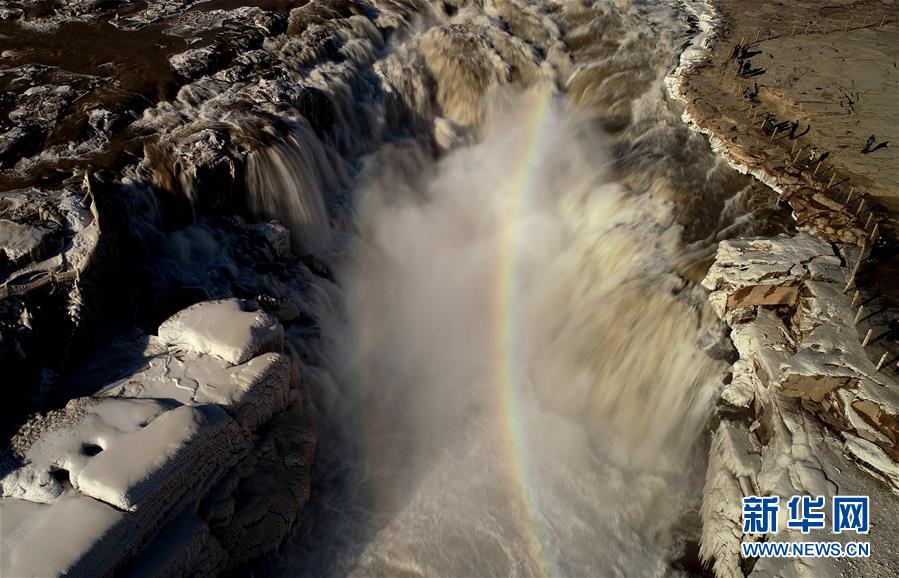 12月11日,黄河壶口瀑布上空出现彩虹,美不胜收(无人机拍摄)。 新华社发(刘宏达 摄)