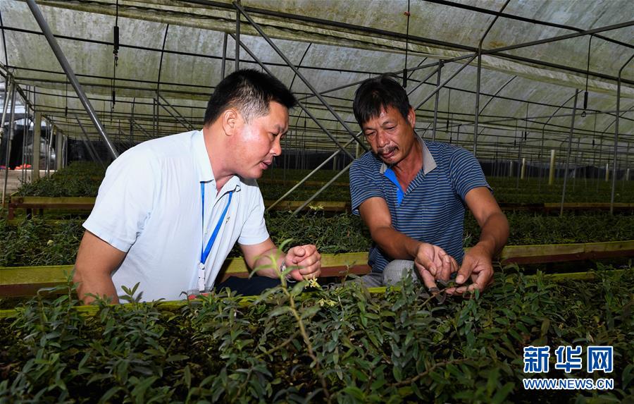 工作人员在海南农垦八一有限公司内的石斛基地检查石斛生长情况(11月13日摄)。新华社记者杨冠宇摄