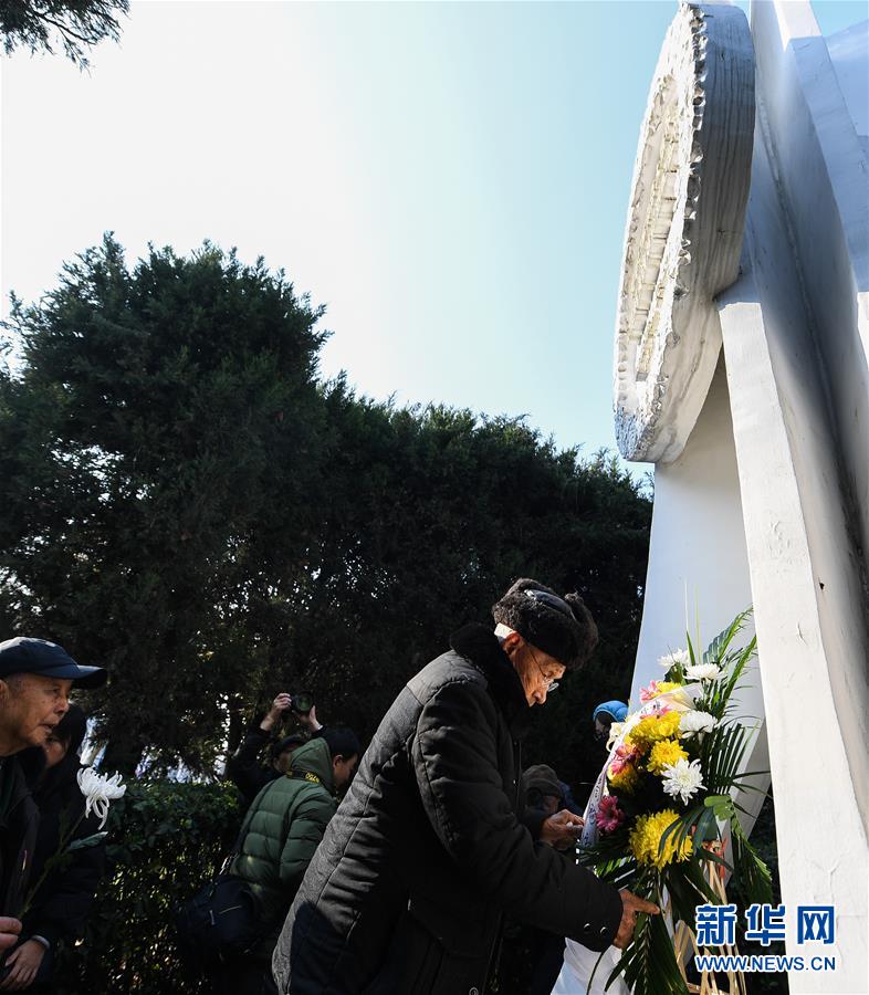 12月12日,抗战老兵在侵华日军南京大屠杀中山码头遇难同胞纪念碑前献花。 当日,来自湖南、江苏等地的4名抗战老兵以及志愿者、南京当地大学生代表等来到侵华日军南京大屠杀中山码头遇难同胞纪念碑前献花、默哀,祭奠遇难同胞。 新华社记者 季春鹏 摄