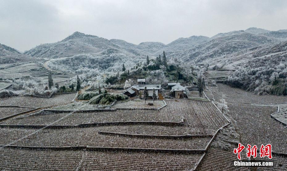 12月12日,受多日强冷空气影响,贵州省遵义市务川仡佬族苗族自治县地势较高地带出现雾松景象,一眼望去冰天雪地,漫山遍野铺满冰晶,景色宜人,美不胜收。图为务川自治县泥高镇栗园村雾凇景观。中新社发 田东 摄