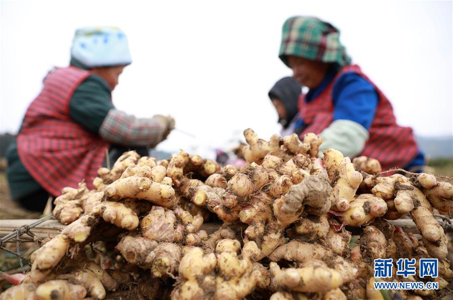 寒冬时节,贵州省黔东南苗族侗族自治州丹寨县1600多亩生姜迎来丰收,各乡镇合作社的社员们抢抓天气,加紧生姜的采收、去枝、清理、运送、分拣等工作,确保市场供应。 新华社发(黄晓海 摄)