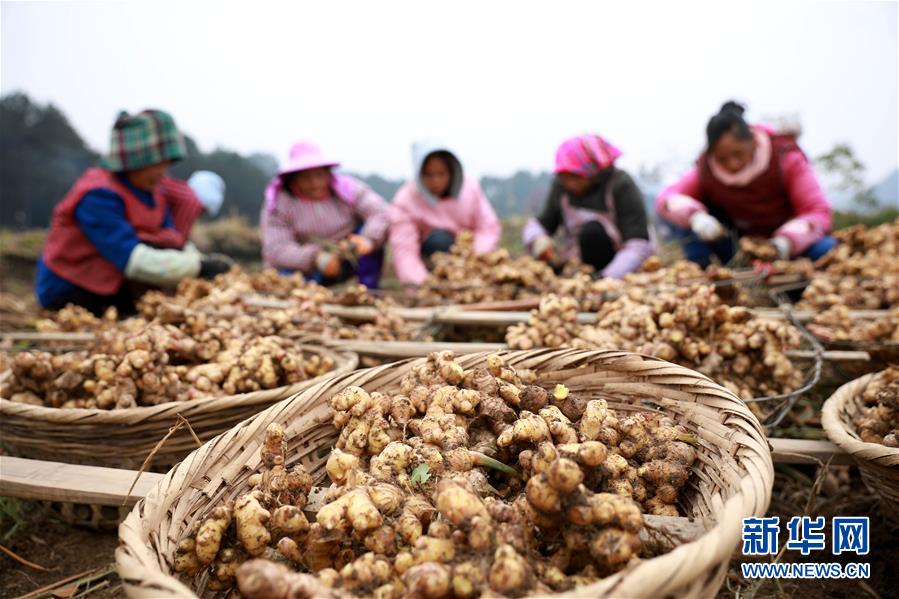 寒冬时节,贵州省黔东南苗族侗族自治州丹寨县1600多亩生姜迎来丰收,各乡镇合作社的社员们抢抓天气,加紧生姜的采收、去枝、清理、运送、分拣等工作,确保市场供应。 新华社发(黄晓海 摄)