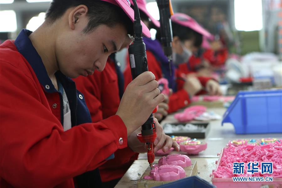 12月12日,在汕头市澄海区,工人在一家玩具企业生产线上进行玩具组装加工。新华社记者 张加扬 摄