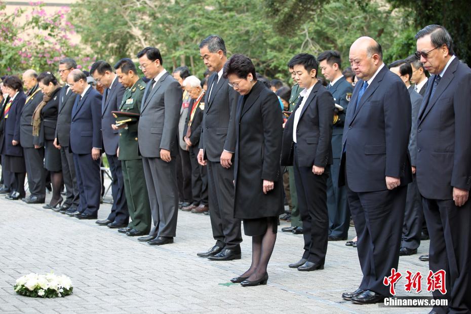 12月13日上午,香港特别行政区政府在香港海防博物馆接待大楼前地举行“南京大屠杀死难者国家公祭日”仪式。行政长官林郑月娥(右三)、中央人民政府驻港机构代表、司法机构代表、政府高级官员、立法会议员、行政会议成员等出席。中新社记者 洪少葵 摄