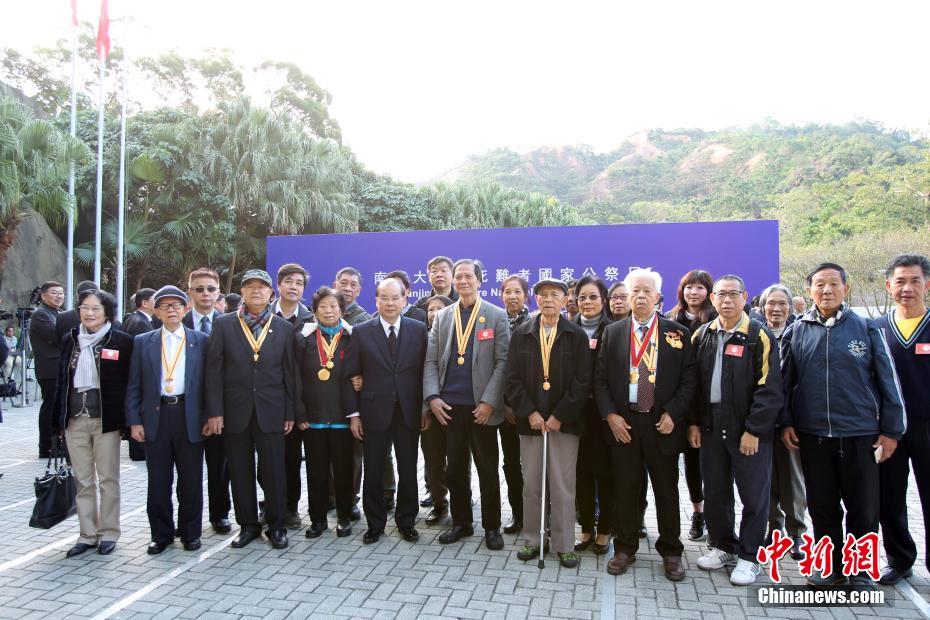 12月13日上午,香港特别行政区政府在香港海防博物馆接待大楼前地举行“南京大屠杀死难者国家公祭日”仪式。图为政务司司长张建宗(左五)与原东江纵队港九独立大队成员及代表合影。中新社记者 洪少葵 摄