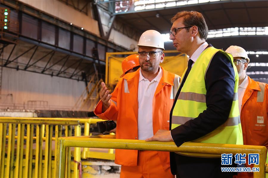 在塞尔维亚斯梅代雷沃,塞尔维亚总统武契奇(右)视察河钢塞尔维亚有限公司(7月5日摄)。新华社记者王慧娟摄