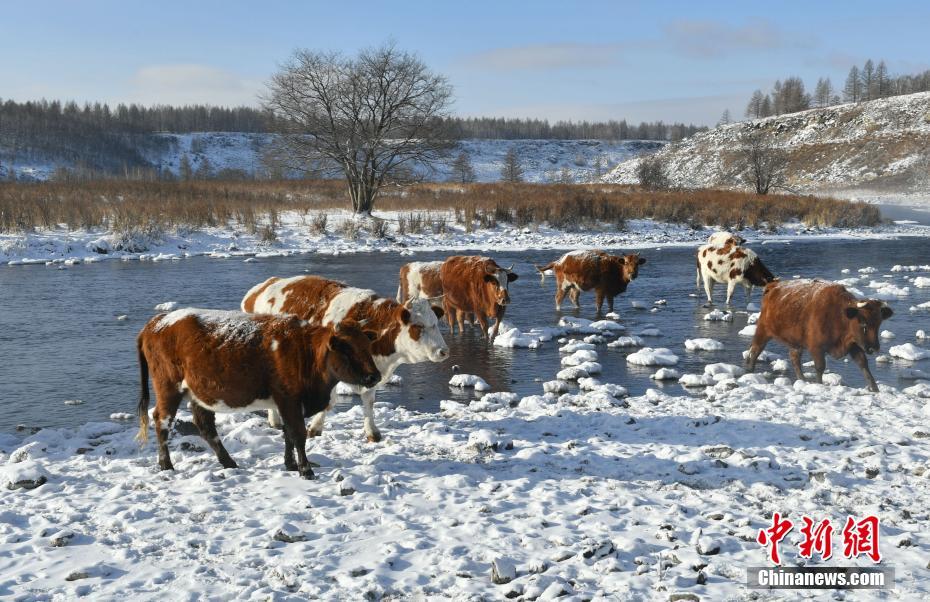12月13日,牛群在“不冻河”饮水。据悉,“不冻河”位于内蒙古自治区兴安盟阿尔山市境内,是距市区74公里处的哈拉哈河的一段河流,该处河段在严冬时节也从不封冻,故被人们称为“不冻河”。“不冻河”河段全长20公里,不冻现象的产生,是由于该河段附近有大量地热的存在。中新社发 钟欣 摄