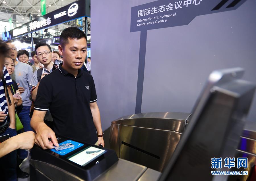 在贵州省贵阳市举行的2018中国国际大数据产业博览会上,参观者在体验支付宝公交刷卡进站系统(5月26日摄)。新华社记者 刘续 摄