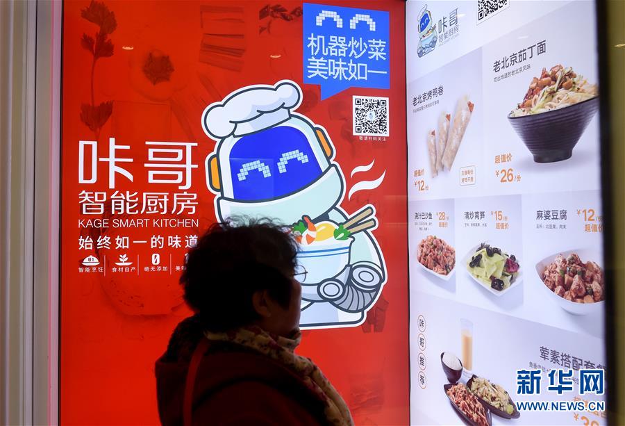 一名顾客在北京东单北大街“咔哥”智能厨房观看推出的菜品。这家餐厅没有厨师,而是用机器人炒菜,引来很多顾客尝鲜(11月7日摄)。 新华社记者 罗晓光 摄