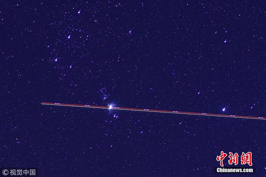 12月14日,青岛,一个夜航班穿过冬季著名的猎户星座的M42猎户座大星云。随着星空摄影的普及,很多初学星空摄影的爱好者、甚至媒体会把民航班机的航行灯误判为流星。一般而言,流星很少超过2秒的时间,如果20-30秒一张照片,在三张照片上都出现“连续流星”,那一定是航班或者卫星等人造物体。这一张照片经过裁剪放大,可以清楚看到“流星”实际是民航班机有“左红、右绿、尾白”之称的三色航行灯。平老虎 摄 图片来源:视觉中国
