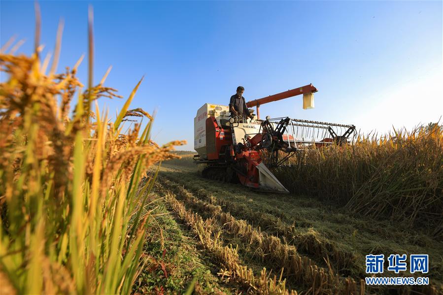 农机在江苏省连云港市赣榆区赣马镇的稻田里收割水稻(10月18日摄)。 新华社发(司伟 摄)