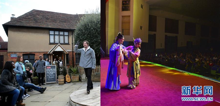 左图:在莎士比亚的故乡英国埃文河畔斯特拉特福镇,演员们为观众演出莎士比亚的剧作(新华社记者韩岩2015年3月24日摄);右图:在汤显祖的故乡中国江西抚州市,两位赣剧演员在为观众演出汤显祖的剧作《牡丹亭》(新华社记者周密2016年10月11日摄,拼版照片)。2016年是莎士比亚和汤显祖两位戏剧大师逝世400周年。