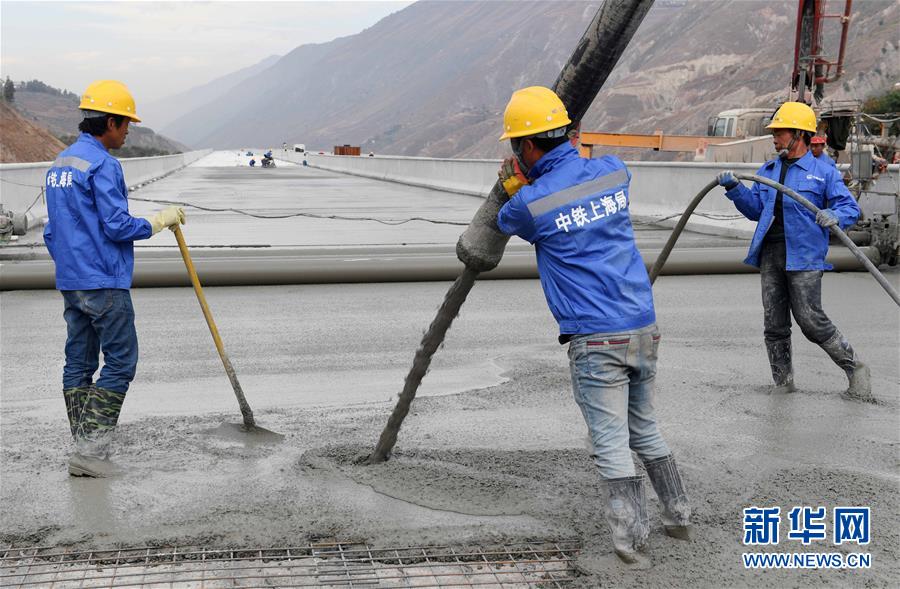12月15日,中铁上海局集团公司的施工人员在东格高速公路土建项目中进行桥面铺装作业。新华社记者杨宗友摄