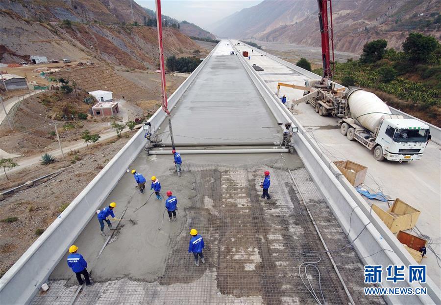 12月15日,中铁上海局集团公司的施工人员在东格高速公路土建项目中进行桥面铺装作业(无人机拍摄)。 新华社记者杨宗友摄