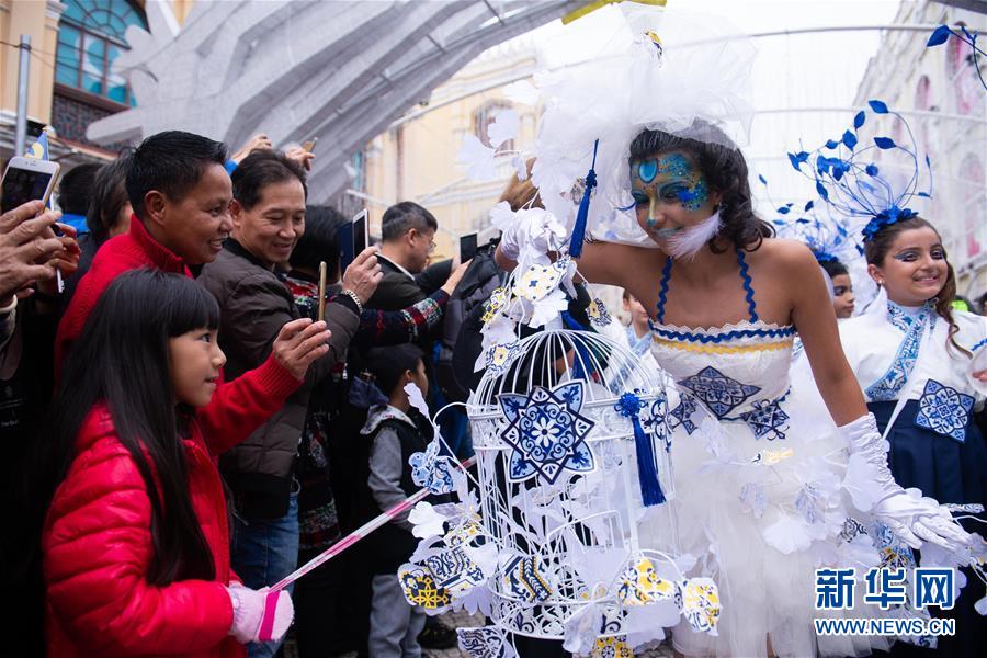 12月16日,表演者在“2018澳门国际幻彩大巡游”活动上。当日,第八届澳门国际幻彩大巡游在著名景点大三巴启动,拉开了澳门庆祝回归祖国十九周年系列活动的序幕。 新华社记者 张金加 摄