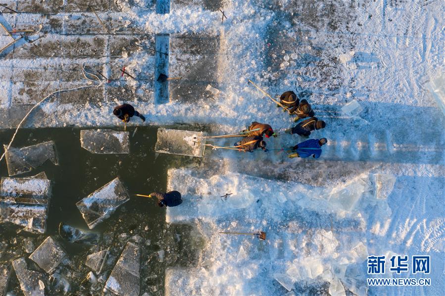 12月16日,采冰工人在松花江哈尔滨段江面工作(无人机航拍)。 新华社发(王昭博 摄)