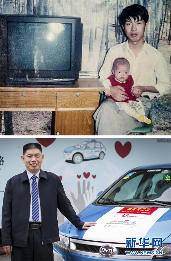 上图为1997年乔学武在湖北襄阳老家抱着孩子拍摄的照片(受访者提供);下图为2018年12月12日,在深圳福田区一处电动车充电站,乔学武站在自己驾驶的出租车前。