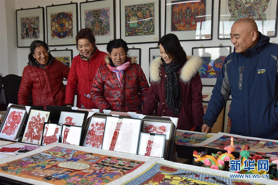 几名农民画画家在陕西省宜君县文化馆内交流(12月12日摄)。 新华社记者都红刚摄