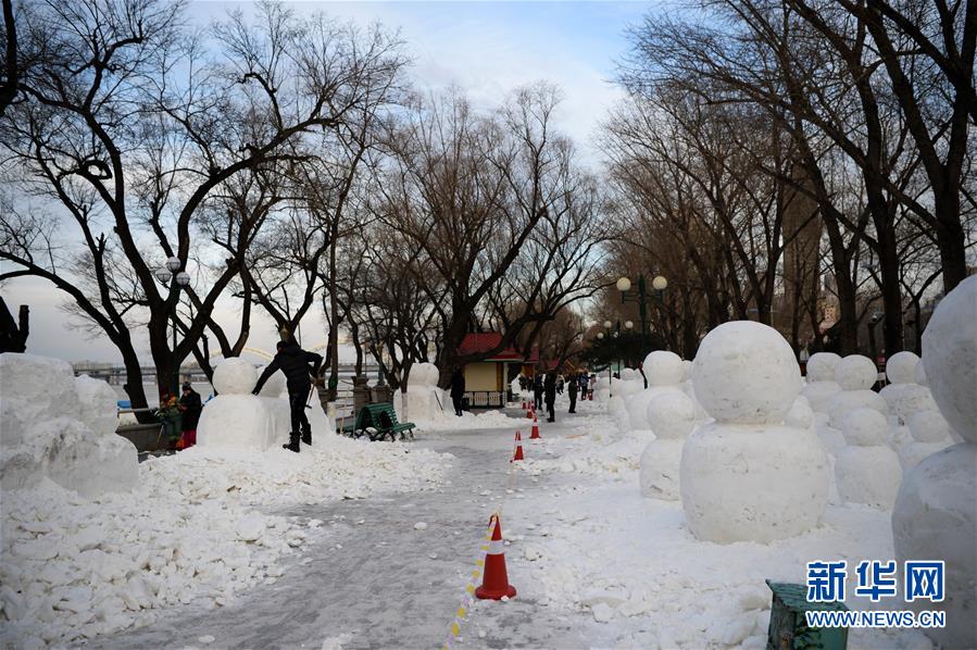12月17日,雪雕师在松花江畔制作雪雕景观。新华社记者王凯摄
