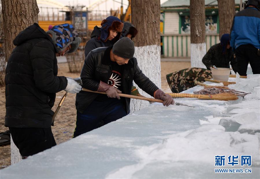 12月17日,冰雕师在松花江畔制作冰雕景观。新华社记者王凯摄
