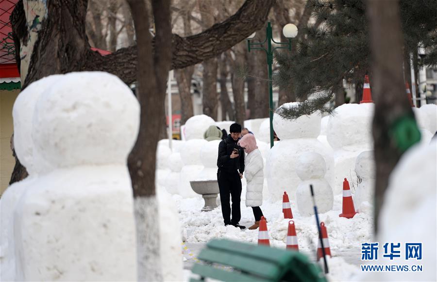 12月17日,游客在松花江畔雪人雕塑区拍照后查看照片。新华社记者王凯摄