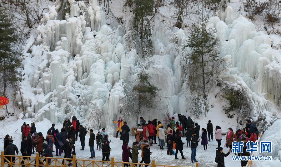 甘肃省临夏回族自治州积石山保安族东乡族撒拉族自治县大敦峡景区的冰瀑、冰挂景观壮观奇美,吸引众多游客前往体验冰雪童话世界。