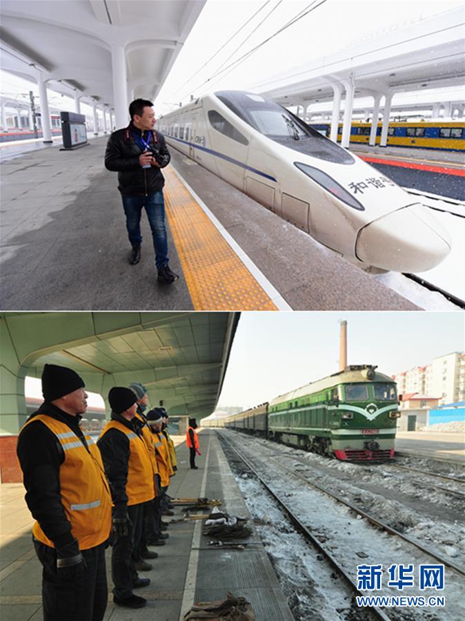 这是一张拼版照片,上图:董治国在牡丹江站站台拍摄联调联试的动车组(2018年11月9日摄),下图:工作人员在牡丹江站站台等待一列绿皮车旅客列车进站(2010年2月16日摄)。 董治国,1978年3月生于黑龙江省牡丹江市。由于他的外公和父亲都是铁路人,董治国很小就萌生了当一名火车司机的梦想。1994年7月,初中毕业的董治国直接考入齐齐哈尔铁路司机学校,三年后进入牡丹江机务段,开始了火车司机生涯。董治国从90年代亲自驾驶内燃机车,到如今采访报道哈牡高铁的建设历程,跟随牡丹江铁路一起走进了高铁时代。 董治国说:“我在铁路上工作了20多年,见证了铁路的发展和巨大变化,我很幸运,也很自豪!” 新华社发(张春祥 摄)