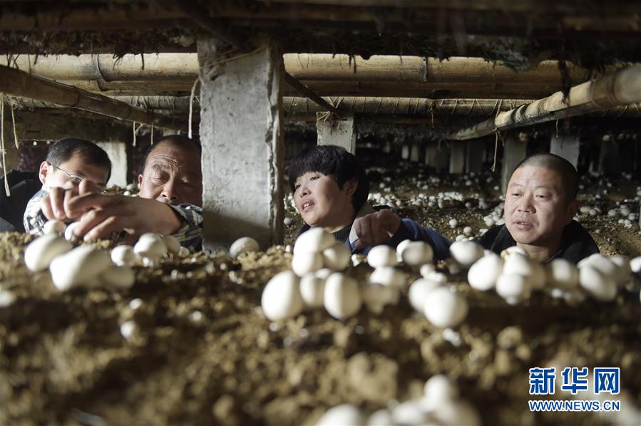 12月18日,在三河市李旗庄镇一家种植企业的“扶贫大棚”里,技术人员(左二)为食用菌种植贫困户讲解双孢菇的种植知识。 新华社记者 鲁鹏 摄