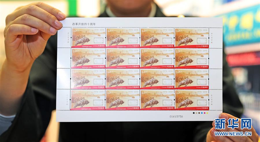 12月18日,在辽宁省档案馆邮政营业所,辽宁邮政工作人员展示《改革开放四十周年》纪念邮票。 新华社记者杨青摄