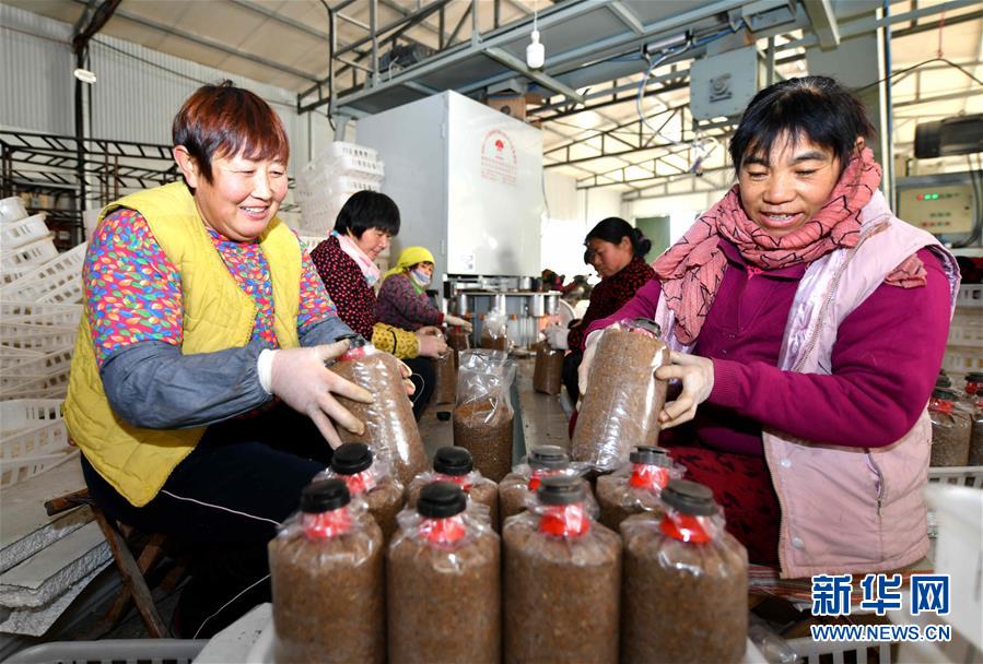 12月18日,山东省高青县花东村村民在制作食用菌培养包。 新华社记者 朱峥 摄
