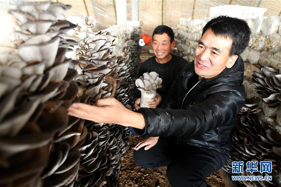 12月18日,山东省高青县花东村驻村第一书记刘然山(右)在检查平菇生长情况。 新华社记者 朱峥 摄