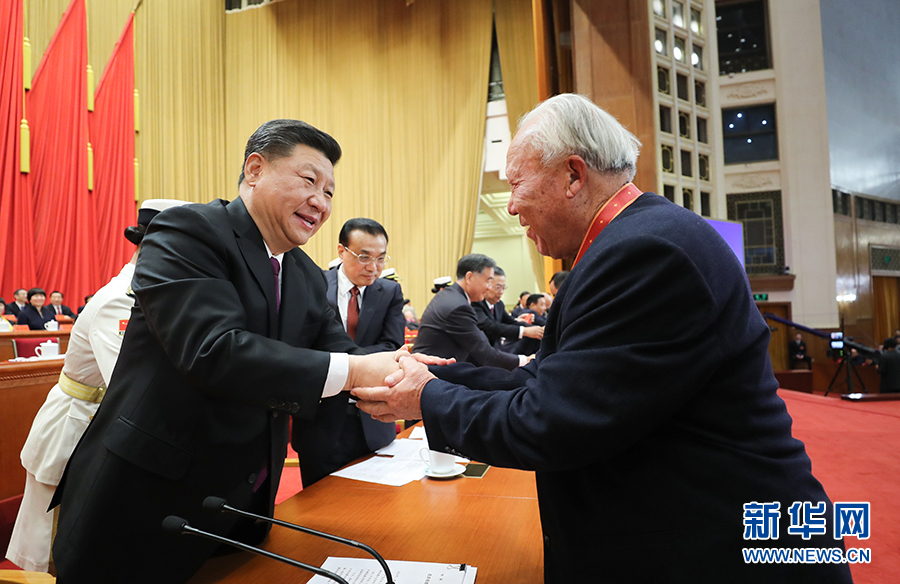 12月18日,庆祝改革开放40周年大会在北京人民大会堂隆重举行。中共中央总书记、国家主席、中央军委主席习近平在大会上发表重要讲话。这是习近平等为获得改革先锋称号人员代表颁奖。 新华社记者 鞠鹏 摄