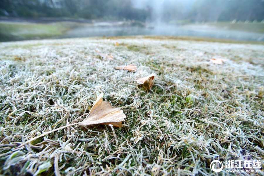 12月18日,西湖景区的草坪披上了一层浓霜。由于暖湿气流相对活跃,杭城昼夜的温差也较大。(浙江在线拍友 里尔 摄)