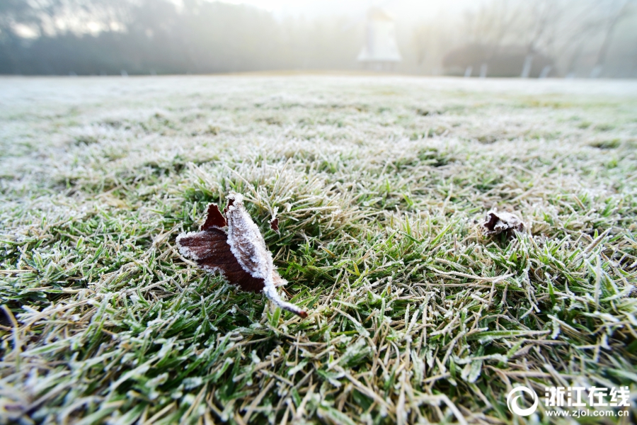 12月18日,西湖景区的草坪披上了一层浓霜。由于暖湿气流相对活跃,杭城昼夜的温差也较大。(浙江在线拍友 里尔 摄)