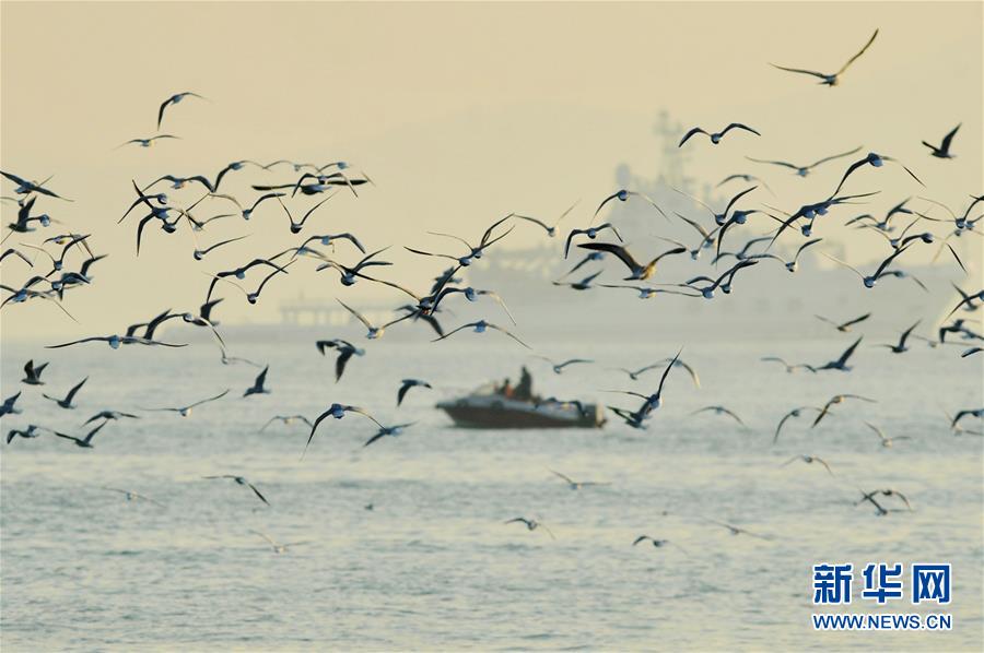 12月18日,红嘴鸥在青岛栈桥景区海面上飞舞。 新华社发(王海滨 摄)