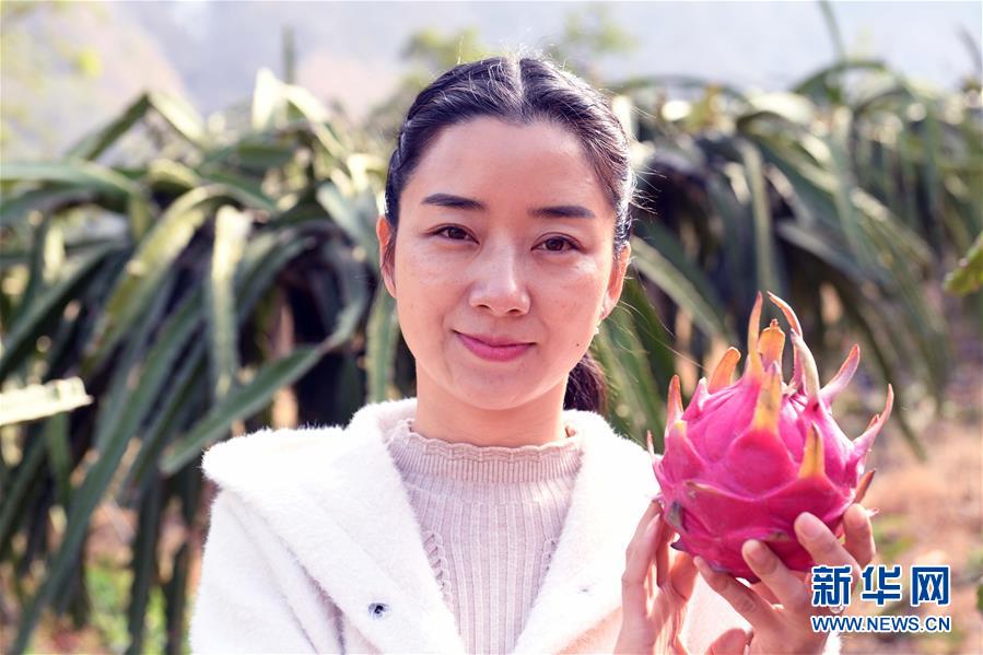 12月17日,徐庆在展示自己公司种植的火龙果。徐庆种植的火龙果出名,人又长得秀气,被称为“小龙女”。徐庆曾经在昆明某杂志社当过编辑,做过生意,生活舒适。2013年,徐庆来到东川投资,把大荒地村泥石流荒滩变成绿洲,2017年种植火龙果300亩获得丰收。村民们把土地统一出租,除了收取地租外,还在徐庆的果园里打工挣钱。同时,村民把产业扶贫资金入股徐庆的公司,每年参与分红。 新华社记者 杨宗友 摄