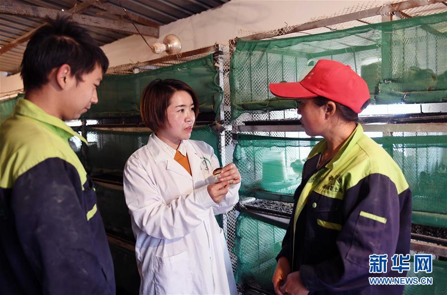 12月18日,马关琴(中)在鸡苗育雏基地与工人交流。 新华社记者 杨宗友 摄