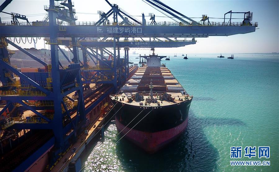12月19日,一艘装载铁矿石的外籍货轮在湄洲湾北岸罗屿港区卸货(无人机拍摄)。近年来,福建省莆田市充分利用沿海港口资源优势,大力发展港口经济,主动承接“海上丝绸之路”相关国家煤炭、铁矿石等大宗货物中转和运输业务,打造东南沿海大宗散货集散中心。截至2018年10月,全市共有千吨级以上泊位20个(其中万吨级以上泊位14个),港口吞吐能力达6266万吨,较“十二五”期末增长68%。新华社记者 张国俊 摄
