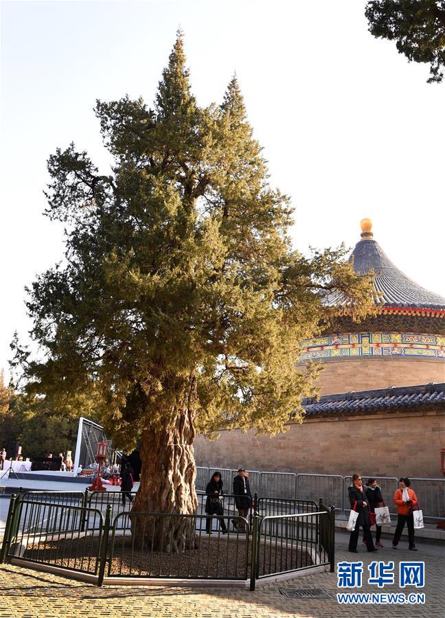 12月19日,游客从北京“最美十大树王”之一的天坛九龙柏下走过。 新华社发(任超摄)