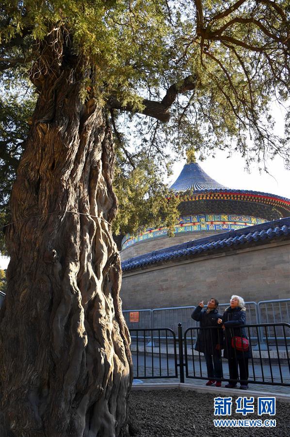 12月19日,游客在观赏北京“最美十大树王”之一的天坛九龙柏。 新华社发(任超摄)