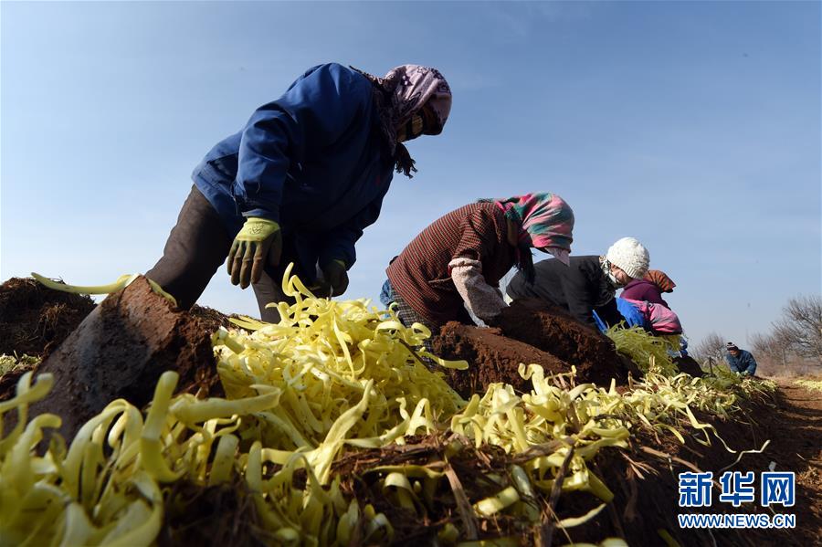 12月19日,在兰州市西固区西柳沟街道张家大坪村,农民在整理收获的韭黄。 临近冬至,甘肃省兰州市西固区西柳沟街道张家大坪村种植的500多亩韭黄喜获丰收,农民们在田间忙得热火朝天。 新华社记者范培珅摄
