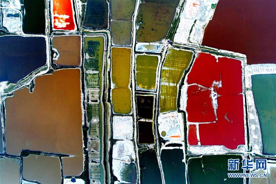 这是2018年7月24日在山西运城盐湖景区航拍的七彩盐湖美景。 大地之色,俯仰之间;壮美山河,是我的祖国。2018年,新华社记者操纵无人机“飞阅”华夏大地,在最美的时节,定格下她的色彩斑斓。 新华社发(薛俊 摄)