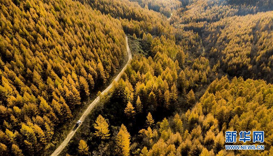 2018年10月8日,一辆汽车行驶在山西省沁源县好地方林场的林间道路上。 大地之色,俯仰之间;壮美山河,是我的祖国。2018年,新华社记者操纵无人机“飞阅”华夏大地,在最美的时节,定格下她的色彩斑斓。 新华社记者 陶明 摄