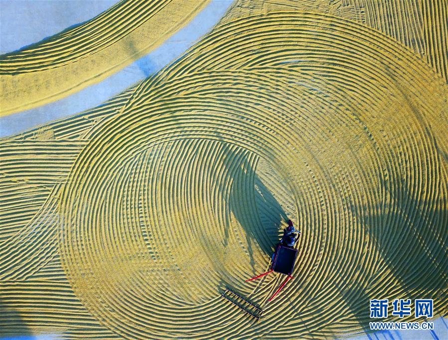 2018年10月29日,在江苏连云港市赣榆区城西镇曲坊村,村民在晾晒稻谷。 大地之色,俯仰之间;壮美山河,是我的祖国。2018年,新华社记者操纵无人机“飞阅”华夏大地,在最美的时节,定格下她的色彩斑斓。 新华社发(耿玉和 摄)