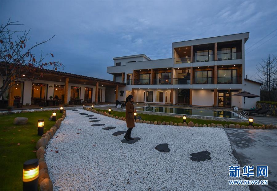 12月19日,游客在民宿“初忆小院”的院子里散步。该民宿是河桥镇“90后”女孩章淑贞开办的,民宿融入了大量的现代建筑设计风格,深受年轻人的喜爱。 新华社记者 徐昱 摄