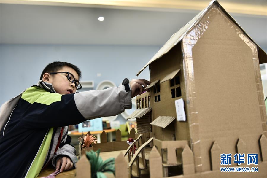 12月19日,一名小学生用瓦楞纸箱和其他辅助材料搭建房屋模型。 当日,安徽省合肥市蜀山区蜀麓小学举办“呵护美丽家园”瓦楞纸创意比赛活动,300多名小学生们利用废旧纸箱等材料搭建各种创意模型,从小树立节约资源、爱护环境的意识。 新华社发(葛宜年 摄)