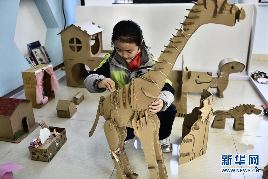 12月19日,一名小学生用瓦楞纸箱和其他辅助材料制作各种动物造型。 当日,安徽省合肥市蜀山区蜀麓小学举办“呵护美丽家园”瓦楞纸创意比赛活动,300多名小学生们利用废旧纸箱等材料搭建各种创意模型,从小树立节约资源、爱护环境的意识。 新华社发(葛宜年 摄)