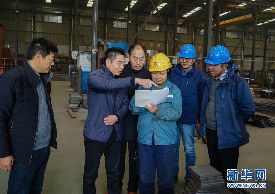 12月19日,在海安市白甸镇一家企业,纪委干部在和村民丁小芹(右三)通过写字交流,向她了解低保金发放以及生活、工作情况。丁小芹是聋哑人,2年前在当地纪委和村干部的帮助下进入一家企业工作。 新华社记者季春鹏摄